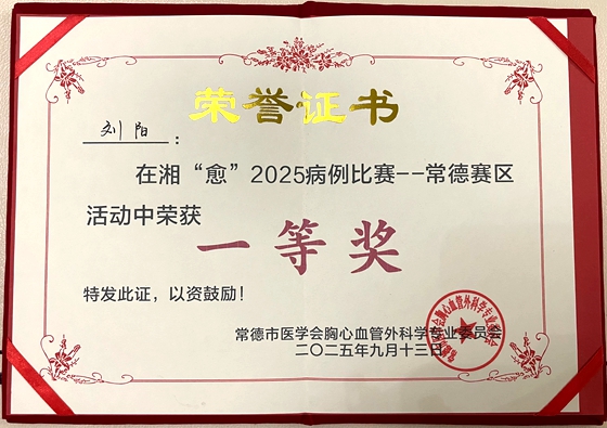近日,由湖南省醫(yī)學(xué)會心胸外科專業(yè)委員會主辦的“肺行沅澧走進(jìn)安鄉(xiāng)”湘“愈”2025病例比賽(常德賽區(qū))在安鄉(xiāng)縣人民醫(yī)院圓滿落幕。湘雅常德醫(yī)院心胸外科劉陽醫(yī)生斬獲一等獎。