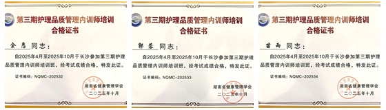 通過系統(tǒng)學(xué)習(xí),護(hù)理部副主任金惠、外科片區(qū)科護(hù)士長(zhǎng)郭蓉、急診科主管護(hù)師苗雨獲得第三期護(hù)理品質(zhì)管理內(nèi)訓(xùn)師培訓(xùn)合格證書。