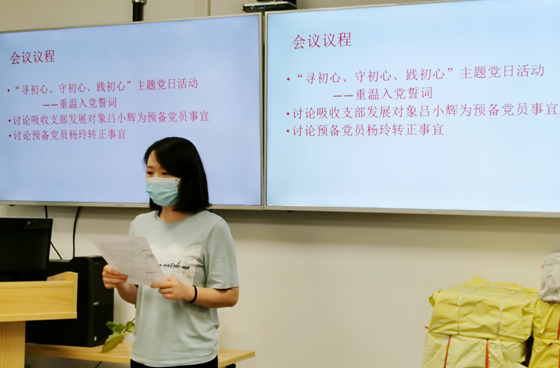 大會首先由支部書記胡命同志宣布大會開始并匯報會議到會情況,向支部黨員說明開會的目的和意義。會議的第一項議程即圍繞“尋初心、守初心、踐初心”的主題重溫入黨誓詞,在支部書記胡命同志的帶領(lǐng)下,與會的黨員全體起立,面對鮮紅黨旗,莊嚴(yán)舉起右拳,以鏗鏘有力的聲音向黨旗再次宣誓,表達(dá)了“尋初心、守初心、踐初心”的信念和決心。