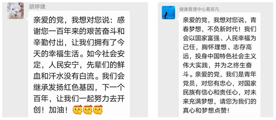 醫(yī)務(wù)部黃炯同志對黨說到:親愛的黨,歷經(jīng)百年,您帶領(lǐng)一代代共產(chǎn)黨人創(chuàng)造了一個個人間奇跡,您領(lǐng)導(dǎo)新中國從站起來到富起來到強起來……作為新時代的共產(chǎn)黨員,我們一定牢記幸福生活的來之不易,也一定牢記您賦予我們的神圣使命,新時代新征程,一切如您所愿!