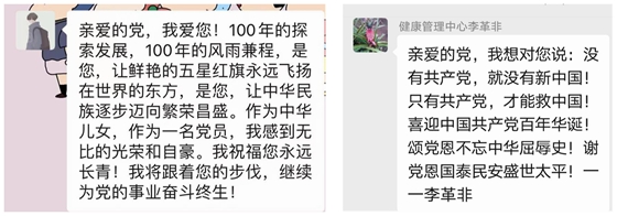 健康管理中心張利輝同志表達到:親愛的黨,我想對您說:100年的風(fēng)雨兼程,是您讓中華名族逐步邁向繁榮昌盛,是您讓中華兒女過上幸福生活!無論在任何情況下,我都將始終保持政治信仰不變,政治立場不移,用實際行動詮釋對您的忠誠!我愛您無怨無悔,我愛您義無反顧!