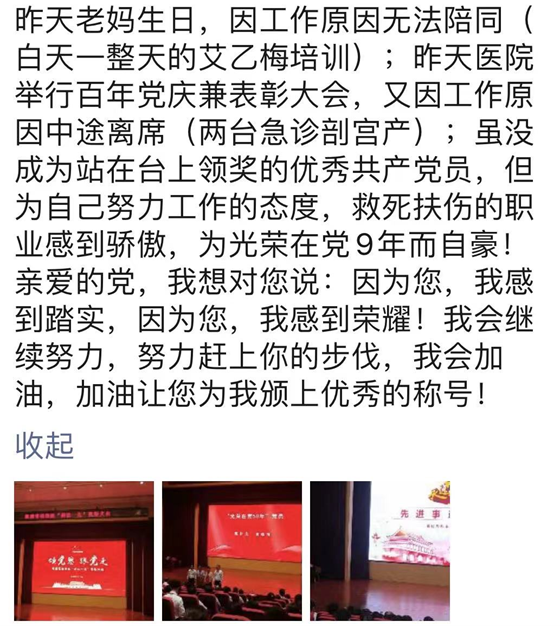 產(chǎn)科熊姍同志感慨到:親愛的黨,我想對您說:因為您,我感到踏實,因為您,我感到榮耀!我會繼續(xù)努力,努力趕上你的步伐,我會加油,加油讓您為我頒上優(yōu)秀的稱號!